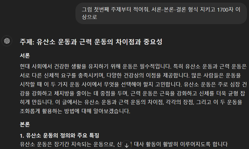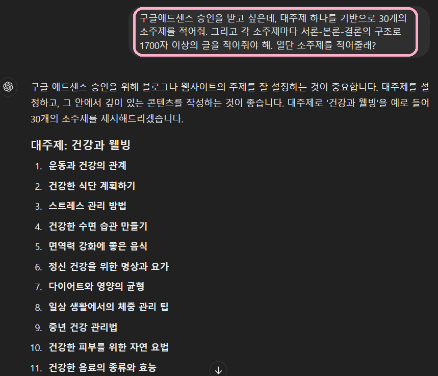 우측 상단이 제가 요청한 내용이고, GPT는 이를 기반으로 소주제를 제시해 주었습니다.
