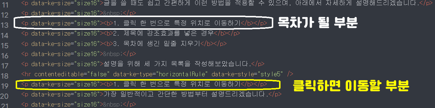 [목차가 될 부분-흰색], [목차 부분을 클릭했을 때 실제로 이동할 부분-노란색] 둘을 구분하기 위해 아래와 같이 표시해 두었습니다.